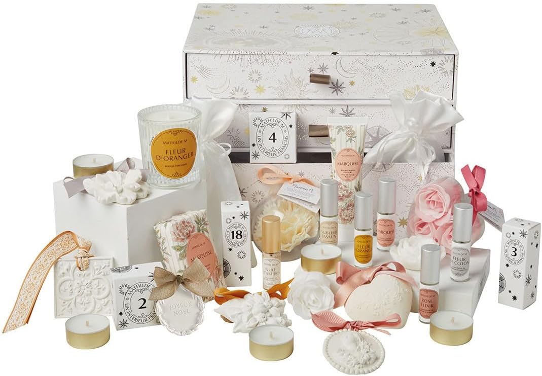 Plongez chaque jour dans l’univers élégant et parfumé de Mathilde M avec un calendrier raffiné qui renferme 24 surprises : bougies parfumées, décors en plâtre et concentrés de parfum aux senteurs iconiques (Fleur de Coton, Fleur d’Oranger, Marquise, Rose Élixir…).